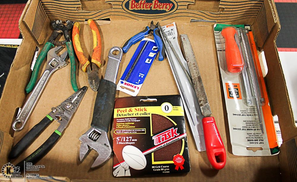 SHARPENING KIT, 2 STIHL FILES, FLAT FILE, HAND TOOLS, SNIPS, GREENLEE WIRE STRIPERS, ETC.