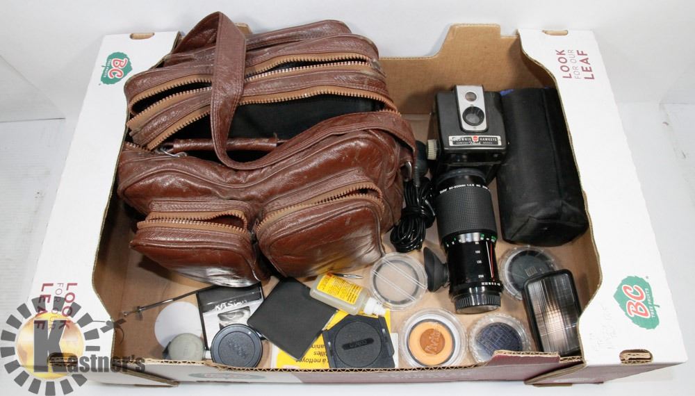 LARGE FLAT OF VINTAGE CAMERA GEAR INCLUDES LENS,
