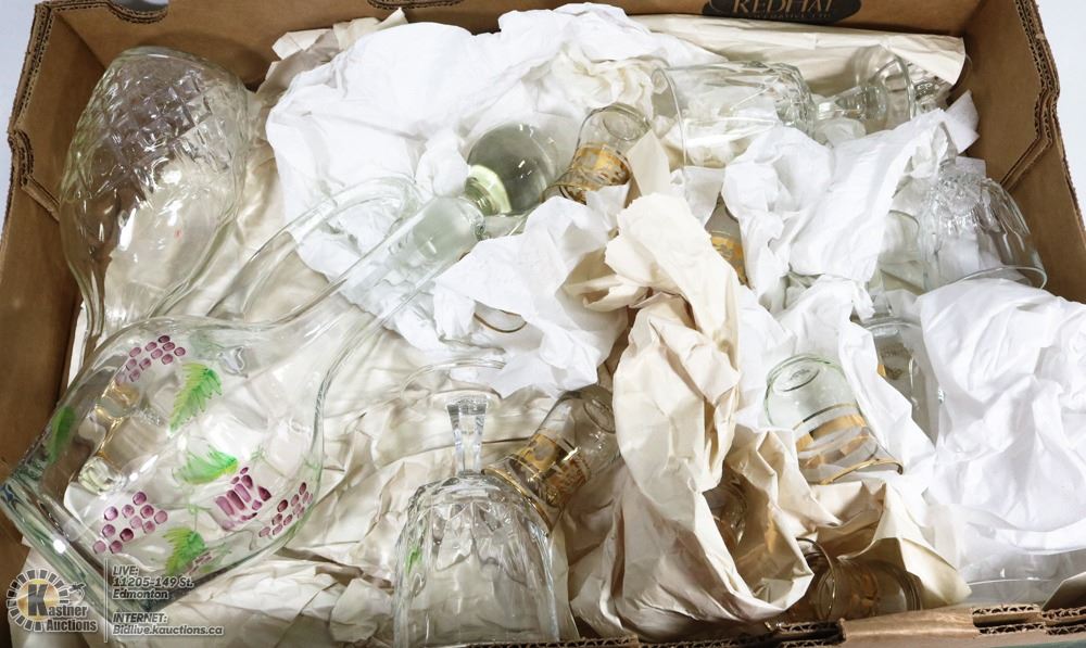 W/STOPPER & 7 GOLD TRIM GLASSES, LARGE WINE DECANTER W/STOPPER AND CRYSTAL GLASSES (NO CHIPS) - HOUSEHOLD