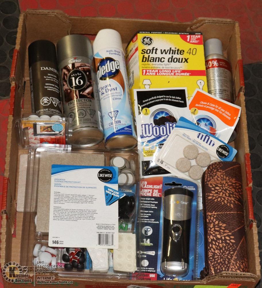 LED FLASHLIGHT, GE LIGHTBULBS, ASSORTED SURFACE PROTECTION KIT, WOOLITE PACKETS, LEATHER & SUEDE CARE, PLEDGE & MORE - GENERAL, HOUSEHOLD