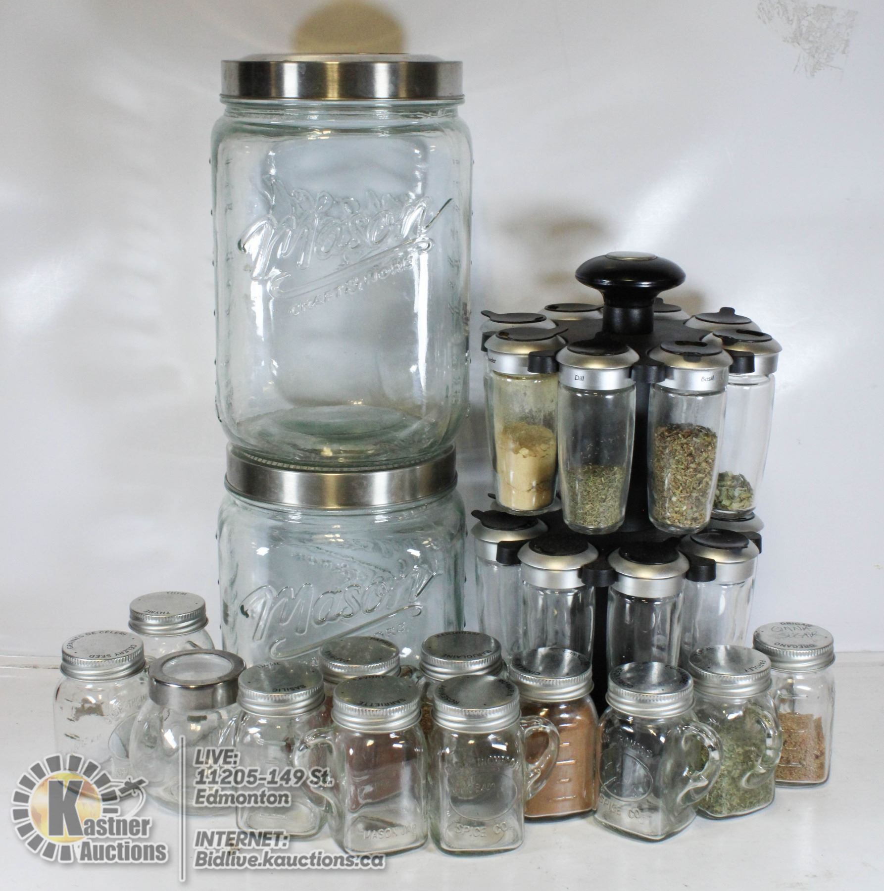 2 XL MASON JAR CLEAR CANNISTERS, 12 ADDITIONAL SPICE GLASS SPICE SHAKERS