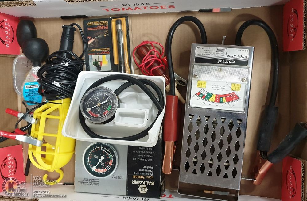 MOTO RAD 6 VOLT/12 VOLT BATTERY TESTER, BALKAMP VACUUM & PRESSURE TESTER, 12 VOLT WORK LIGHT, DELUXE ANTIFREEZE TESTER, SLIM POCKET MATE LITE, ETC. - GENERAL, AUTO