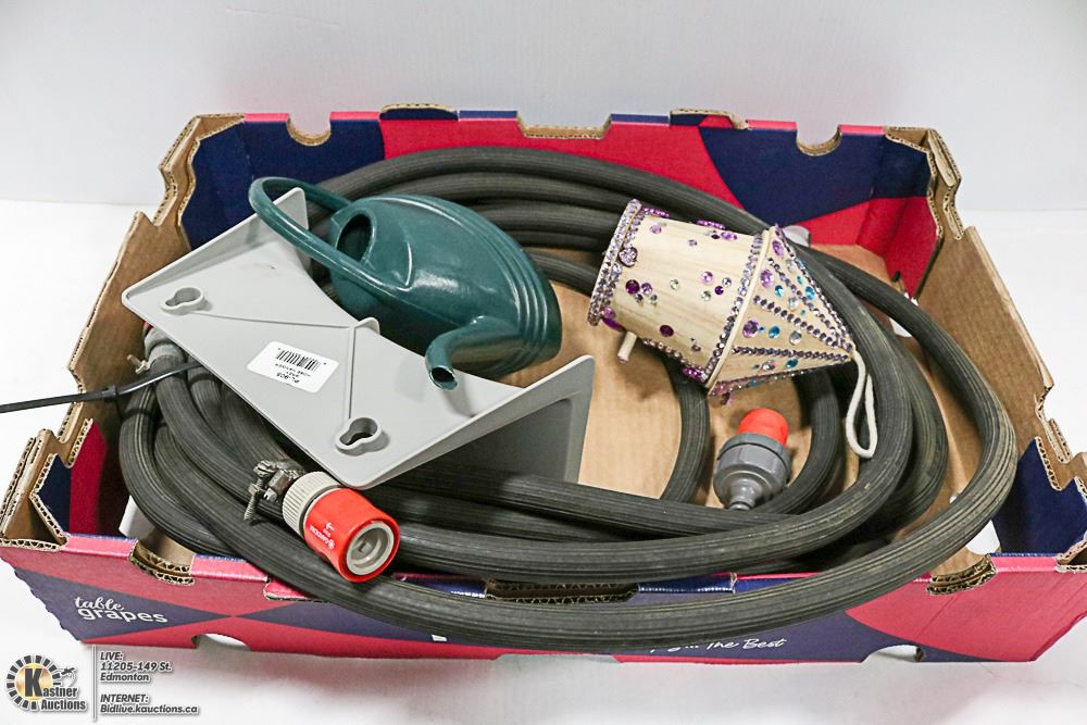 BLACK RUBBER GARDEN HOSE, MULTIPLE GARDENER FITTINGS, HOSE HANGER, BIRD HOUSE, WATERING CAN