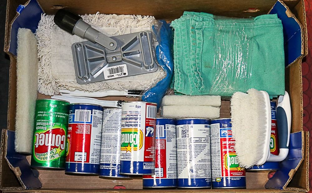 INCL. 8X TINS OF COMET DISINFECTANT CLEANSER, 4X PUMIE SCOURING STICKS FOR PORCELAIN AND TILE, BUNDLE OF WIPING/CLEANING CLOTHS, SCRUBBERS, BRUSHES, ETC.