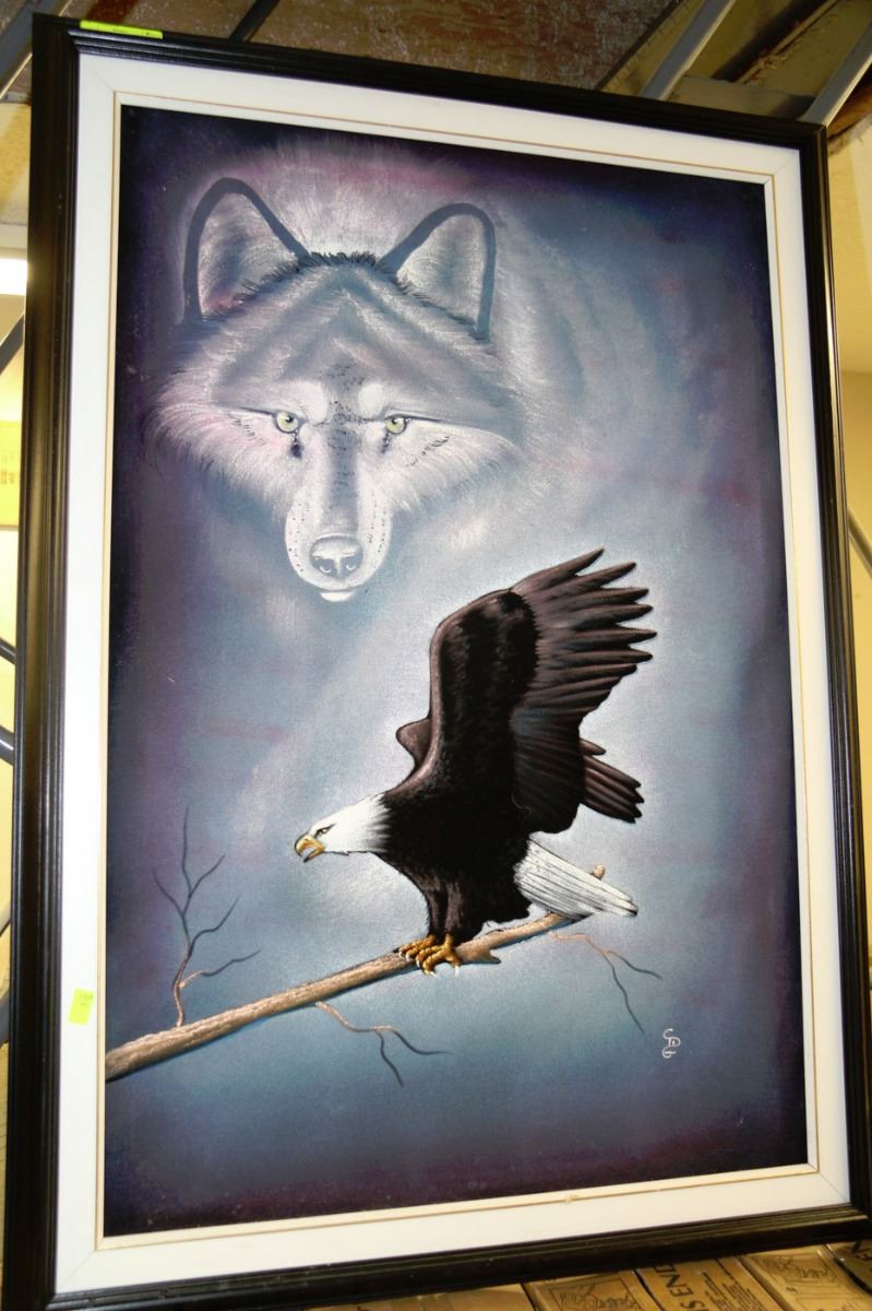 LARGE FRAMED CANVAS WOLF AND EAGLE PAINTING