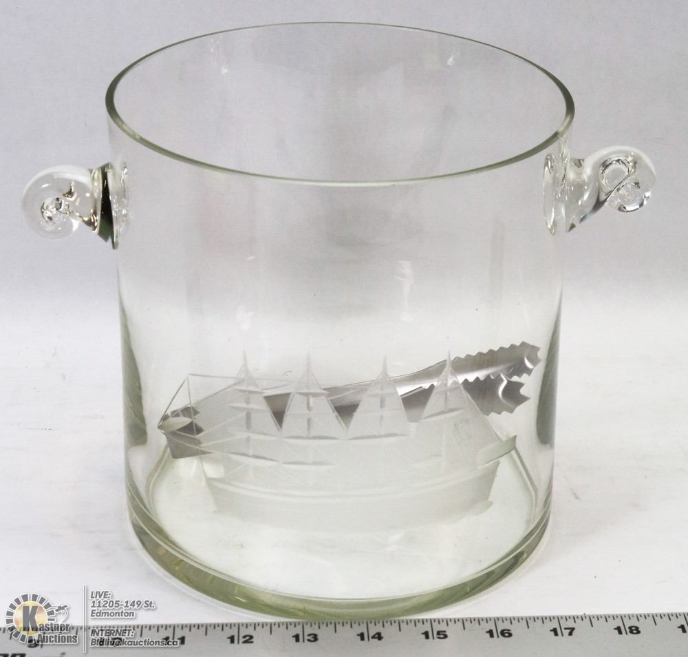 HAS LARGE ETCHED SHIP DESIGN AND 2 CURVED HANDLES COMES WITH ICE TONGS HOUSEHOLD COLLECTABLES