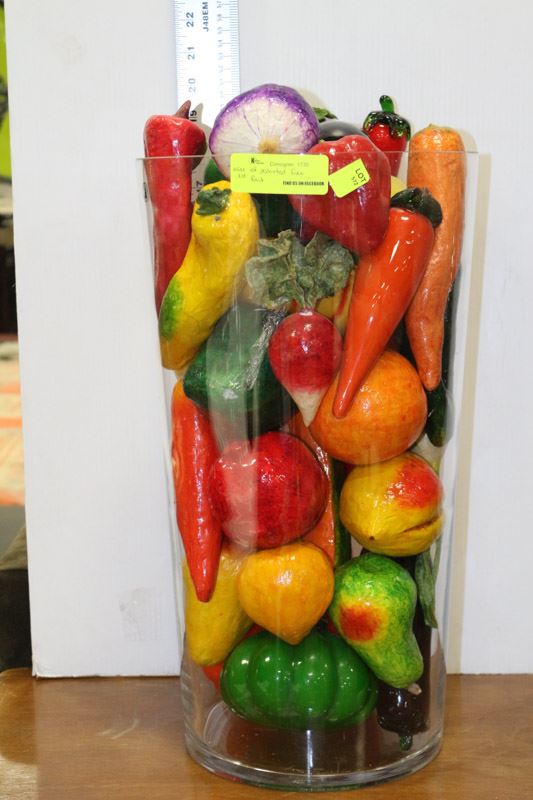 LARGE GLASS VASE W/ GLASS VEGGIES AND FRUITS