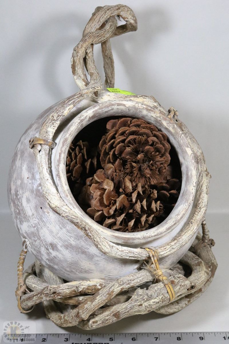 VASE WITH WOOD CARRY HANDLE - 12"W X 14"H
