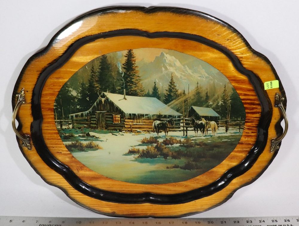 21 INCHES WIDE , CABIN SCENE ON TRAY, BRASS HANDLES