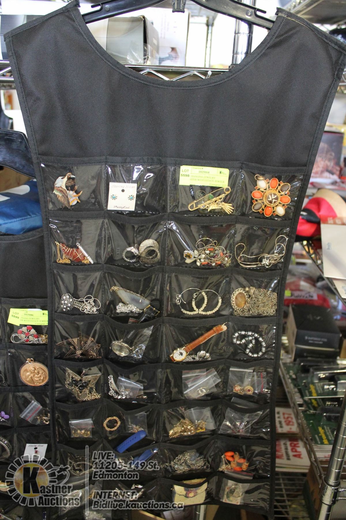 LARGE HANGING JEWELRY ORGANIZER WITH ESTATE JEWELR SOME STERLING SILVER, WATCHES (TIMEX AND MORE), E