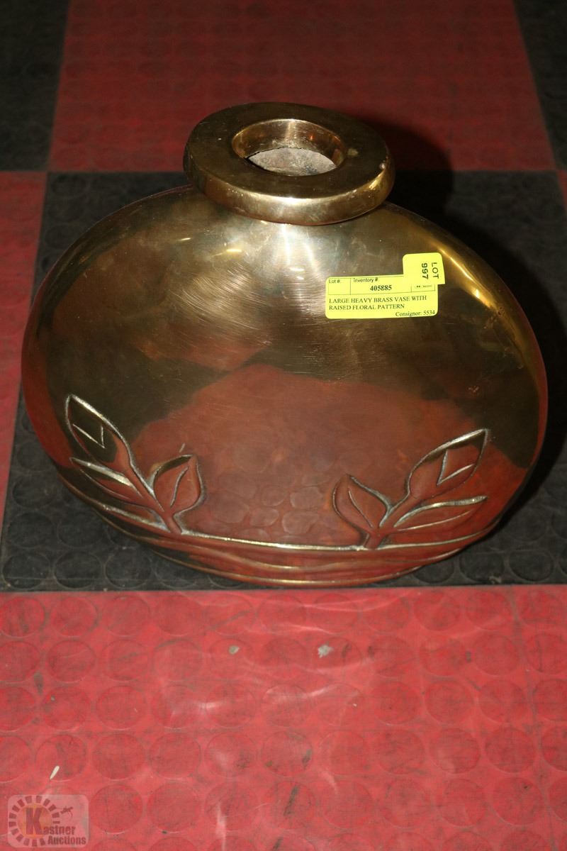 LARGE HEAVY BRASS VASE WITH RAISED FLORAL PATTERN