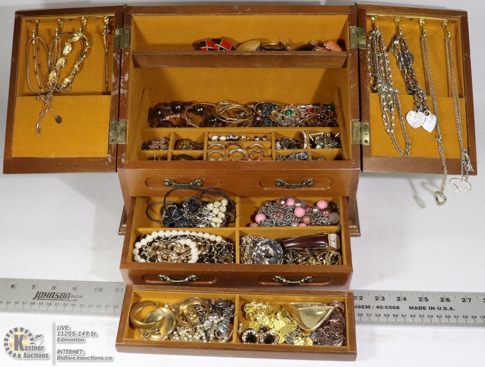 CONTAINS RINGS, EARRINGS, LOCKET, BRACELETS, NECKLACES, PENDANTS ON CHAINS ETC. JEWELRY. STANDS 9.5" HIGH. MUSIC BOX WORKS WIND AND OPEN BOTTOM DRAWER TO PLAY. JEWELLERY