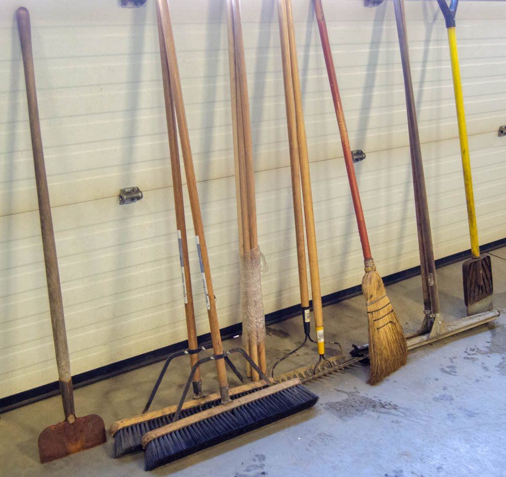 INCL: 2 - 24" PUSH BROOMS, 2 RAKES, 2 SQUEEGEES, 2 ICE CHIPPERS, 1 BROOM , 4 BROOM HANDLES & SNOW SHOVEL