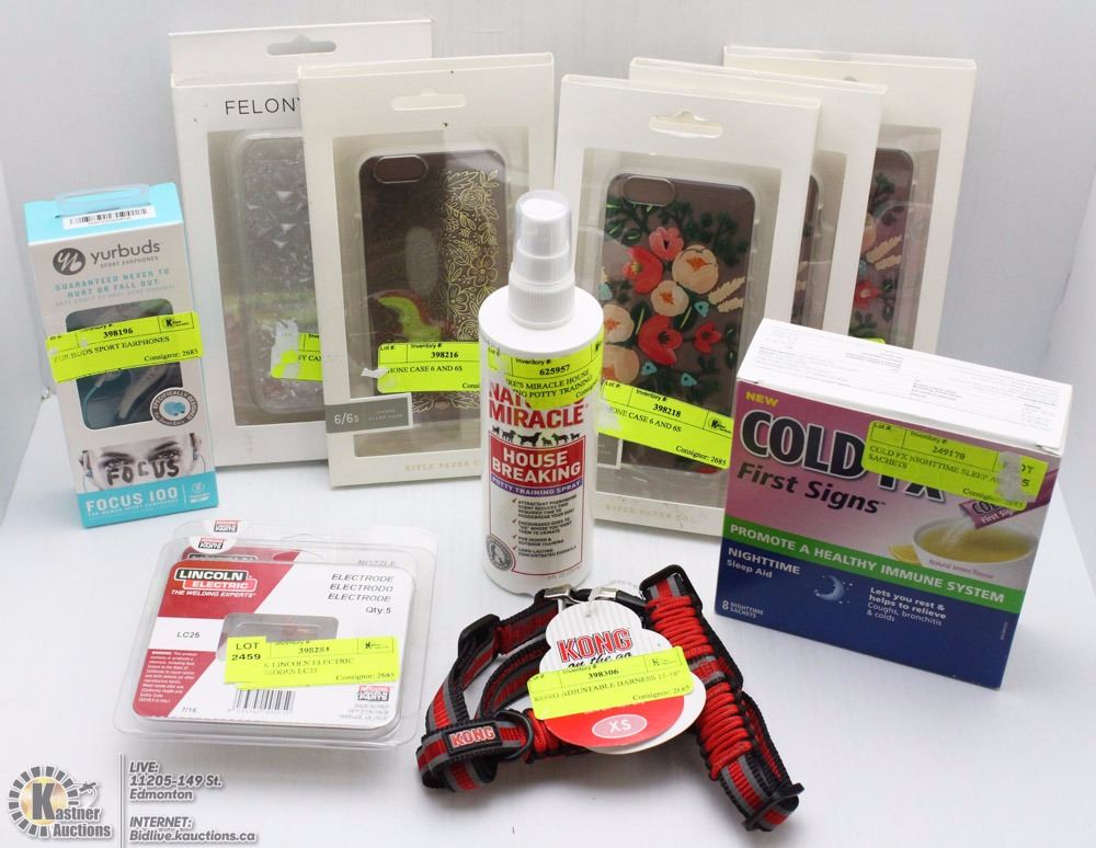 NOZZLES, EARBUD HEADPHONES,5 ASSORTED CELL PHONE CASES, COLD FX , NIGHT TIME SLEEP AID, NATURE MIRACLES POTTY TRAINING SPRAY AND KONG ADJUSTABLE HARNESS XS