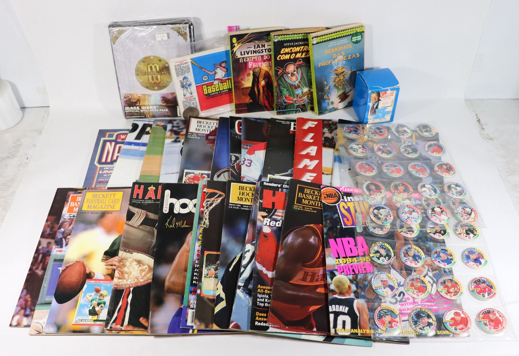 OTHER ASSORTED ITEMS, POGS, ECT, AND PORTUGUESE STEVE JACKSON + MORE SET OF 3 BOOKS AVENTURAS FANTASTICAS WORN CONDITION AND MAGE WARS OFFICIAL SPELLBOOK PACK