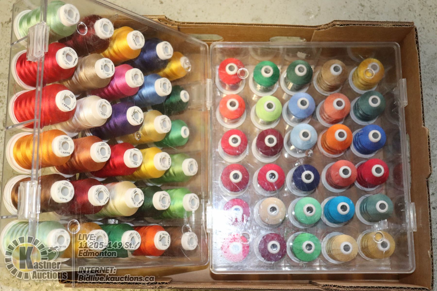 60 LARGE SPOOLS OF THREAD IN 2 STORAGE CASES. MOST NEW AND NON SMOKING HOME
