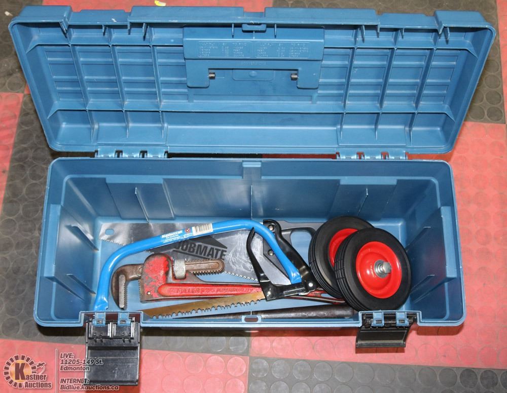 10" X 25" X 9.5"H. INCLUDES A SAW, 18" PIPE WRENCH, BUCKSAW, HUGE PUNCH, WHEELS. TOOLS.