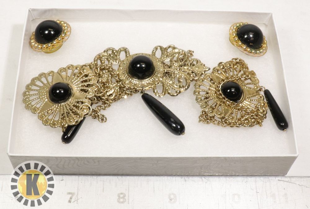 INCLUDED ARE THREE BROOCHED AND A SET OF EARRINGS. COMPLETE WITH BOX. VINTAGE.***ITEM LOCATED IN LETHBRIDGE AB