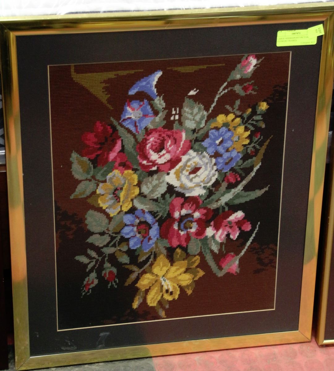 LARGE NEEDLEPOINT PICTURE OF FLOWERS FRAMED