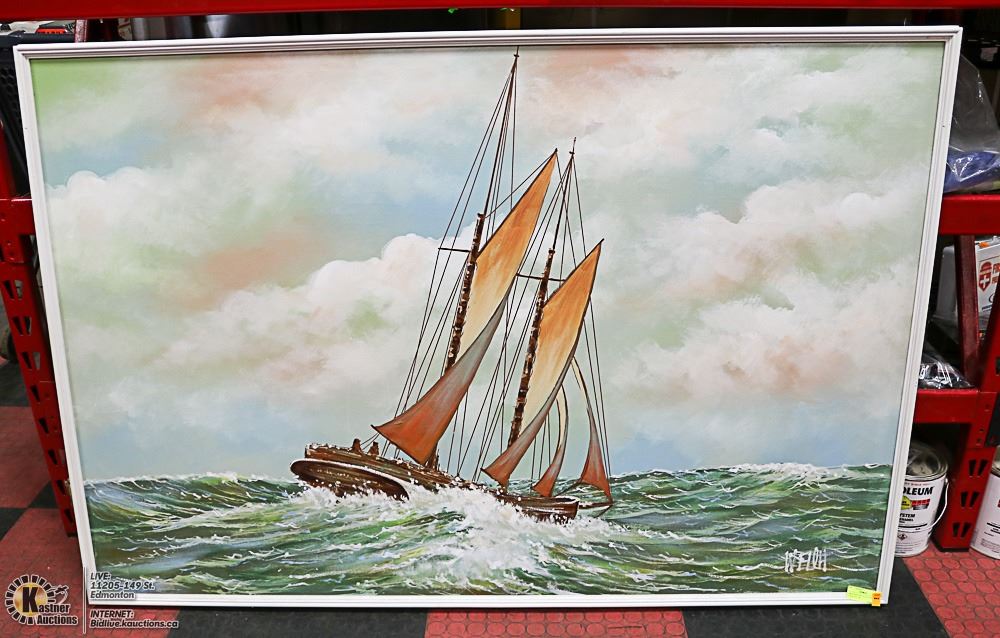 LARGE PAINTING OF SAILING SHIP AT SEA, OIL ON
