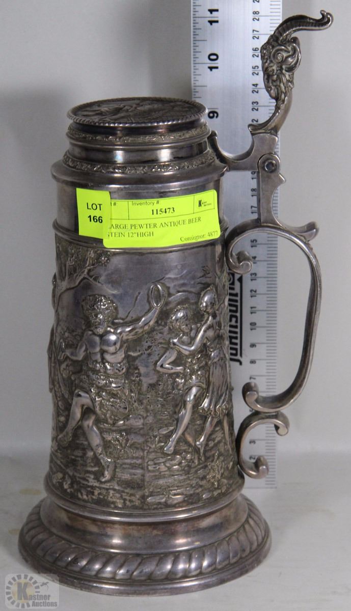 LARGE PEWTER ANTIQUE BEER STEIN 12"HIGH