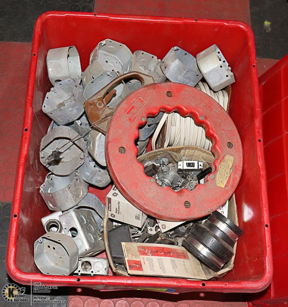 LID FULL OF ELECTRICAL SUPPLIES AND TOOLS INCL. 14/2 WIRE, BOXES, WIRE FISH TOOL, ETC. - TOOLS