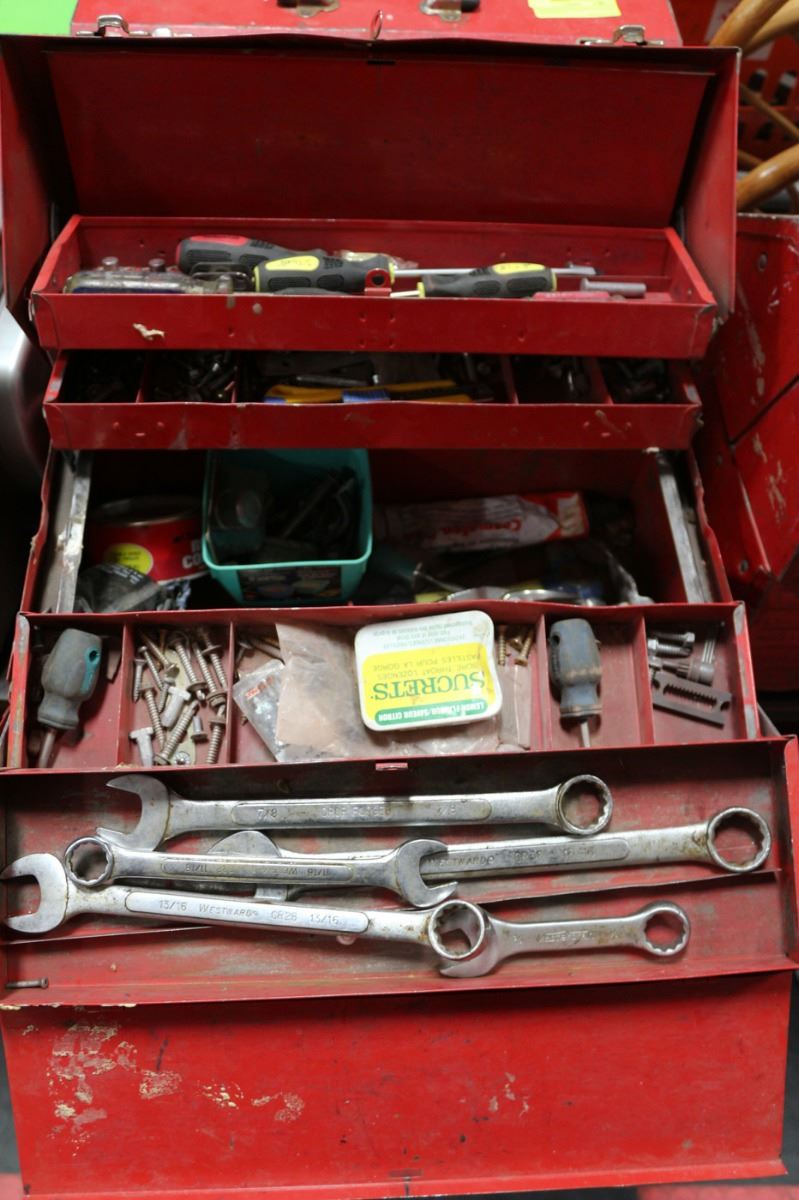 LARGE RED METAL TOOL BOX WITH CONTENTS