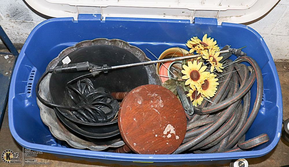 LARGE RUBBERMAID TOTE FULL OF GARDEN MISC.