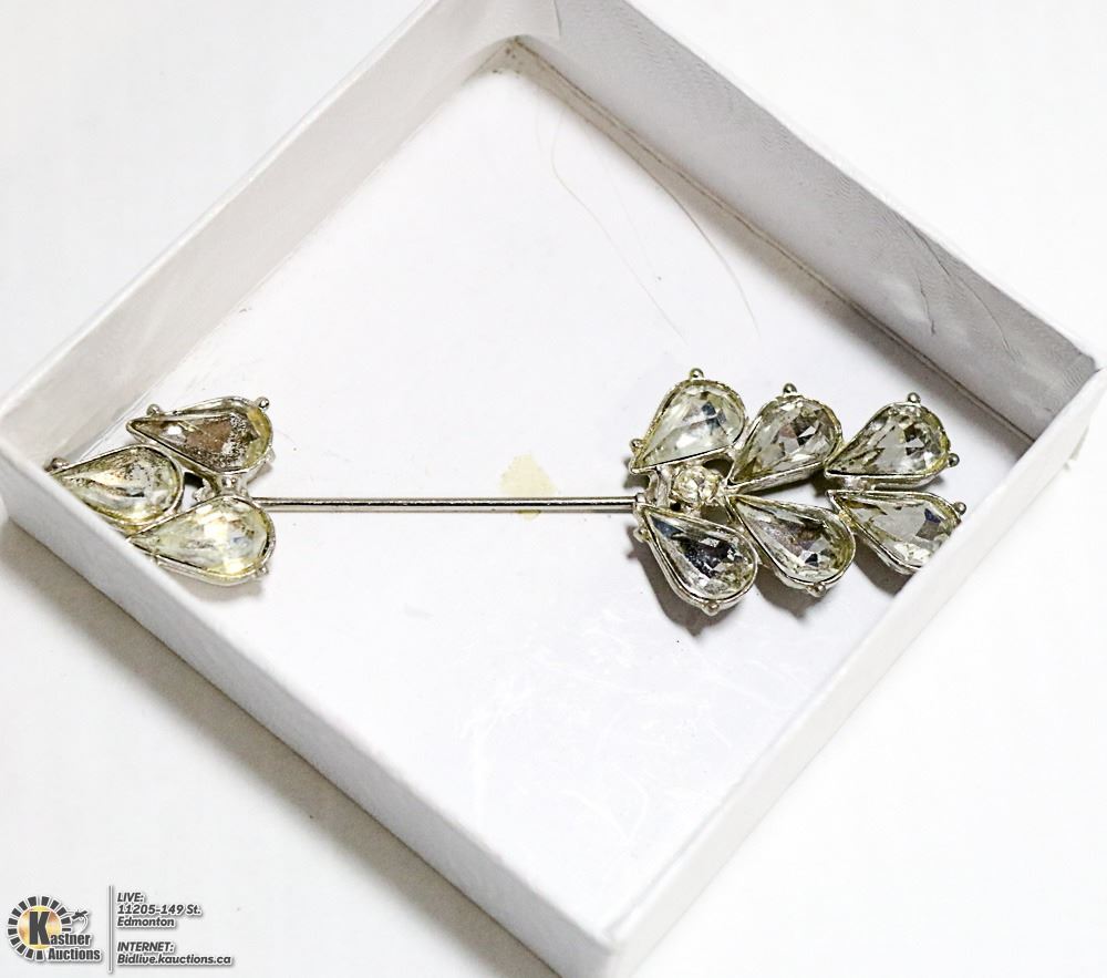 LARGE SILVER HAT PIN WITH RHINESTONES ON BOTH