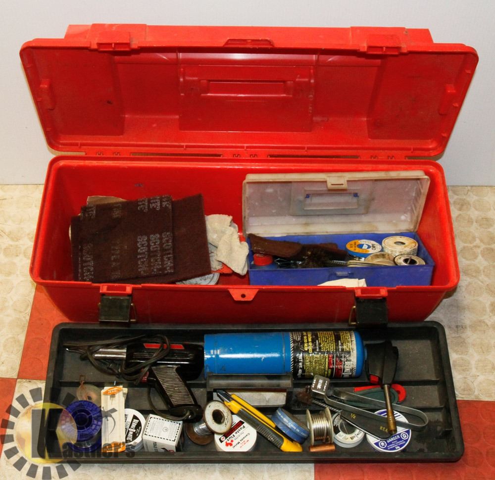 LARGE TOOL BOX FILLED WITH SOLDERING ACCESSORIES