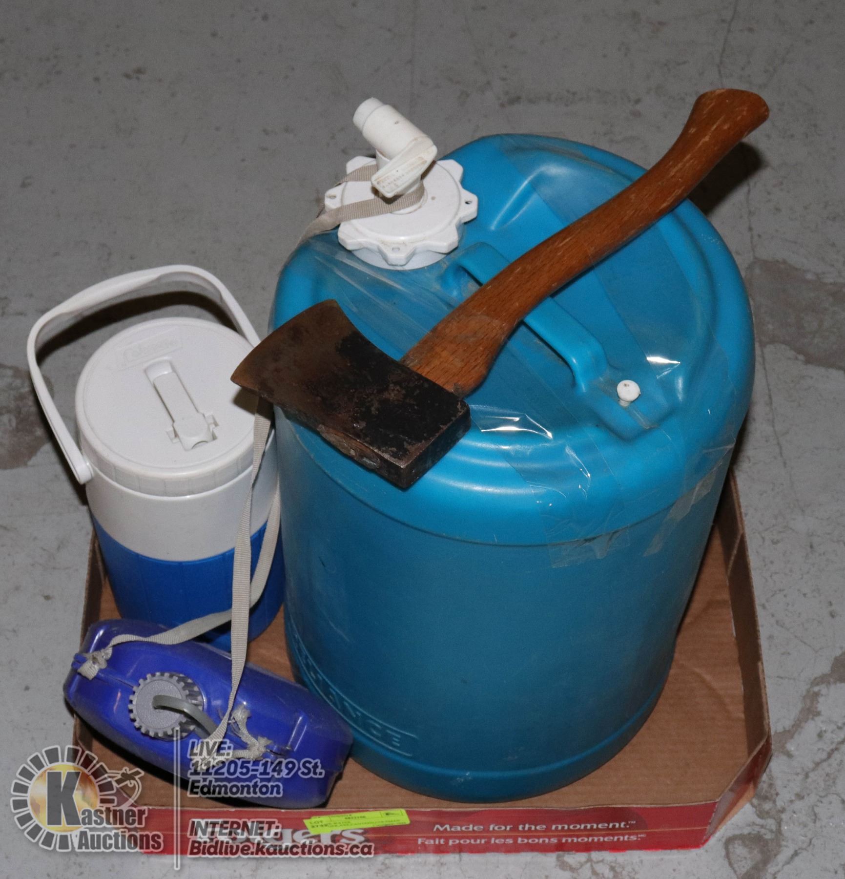 LARGE WATER CARRIER,AXE,CANTEEN,COLEMAN JUG