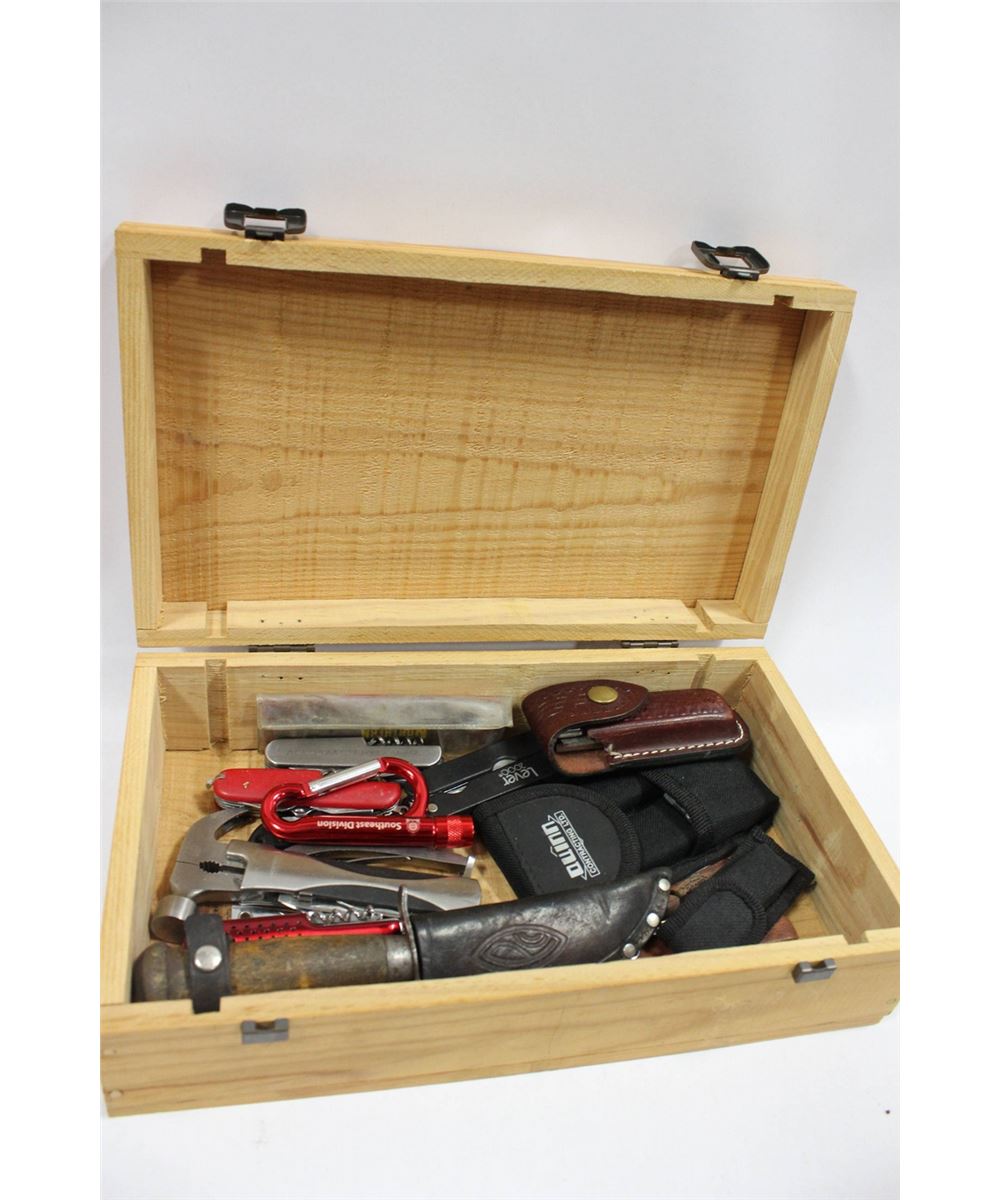 LARGE WOOD BOX W/ LOTS OF KNIVES