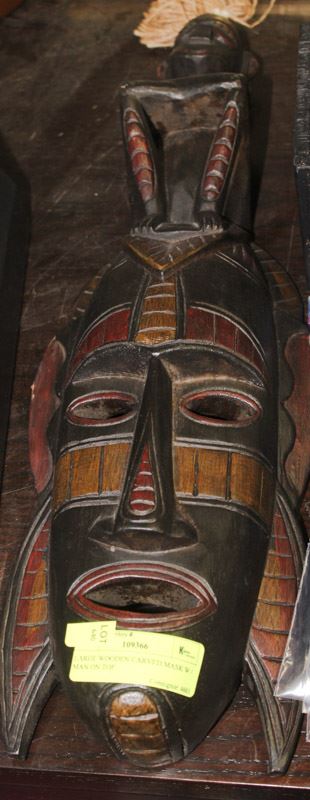 LARGE WOODEN CARVED MASK W / MAN ON TOP