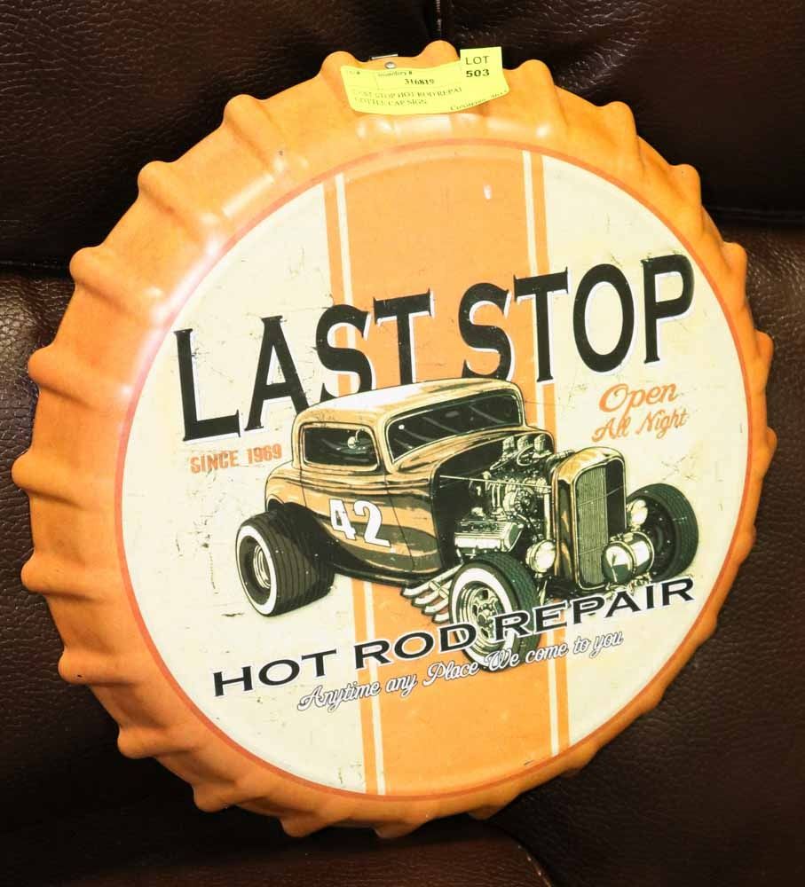 LAST STOP HOT ROD REPAIR BOTTLE CAP SIGN.