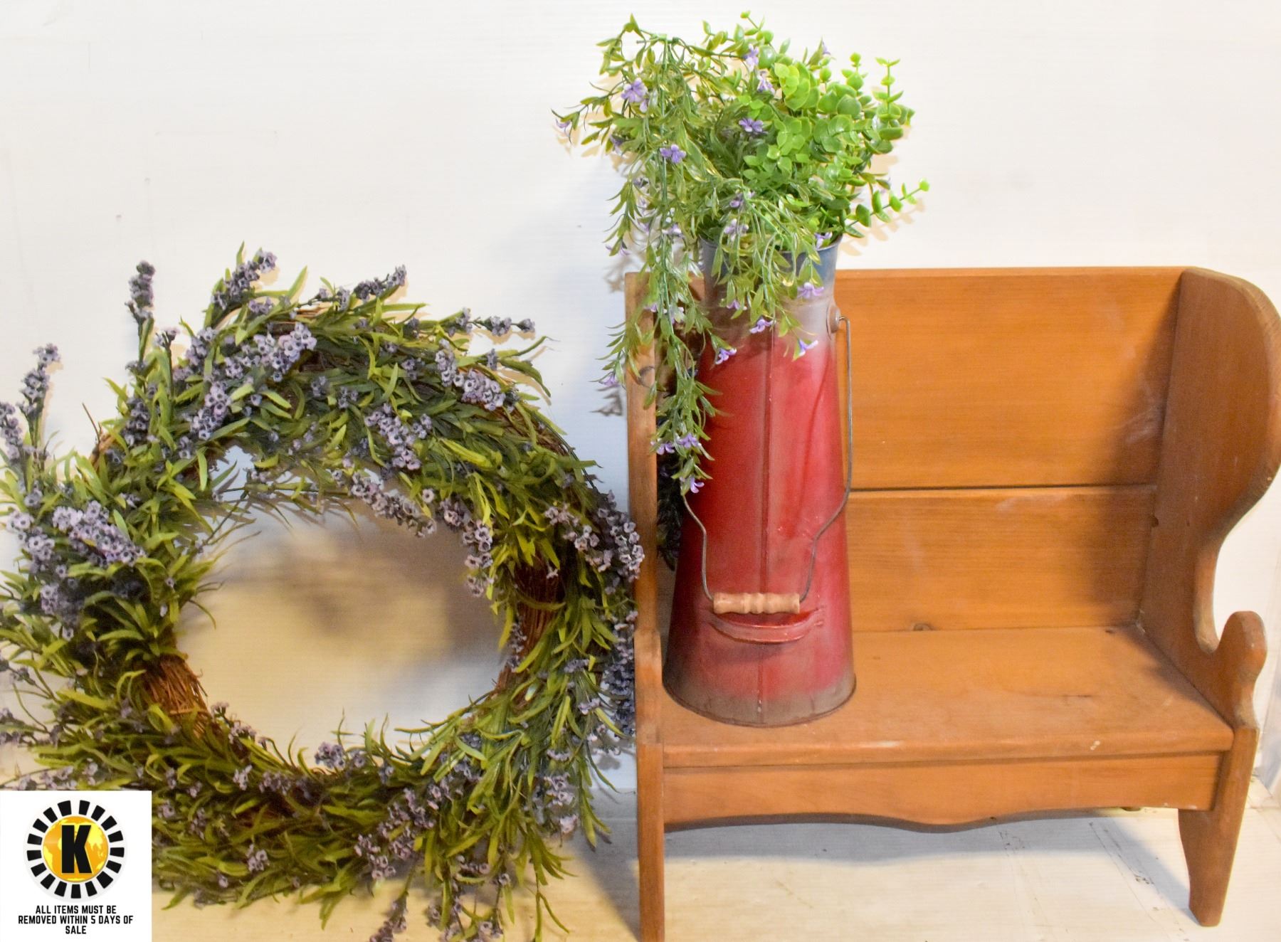 LAVENDER DOOR WREATH, POT W/ LAVENDER & WOOD BENCH