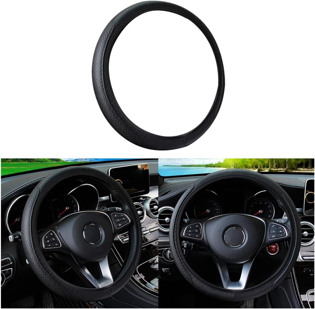 LEATHER CAR STEERING WHEEL COVER, ELASTIC, BREATHABLE ANTI-SLIP, UNIVERSAL 15 INCH, STEERING WHEEL COVER FOR MEN WOMEN, CAR ACCESSORIES FOR MOST CARS (BLACK)