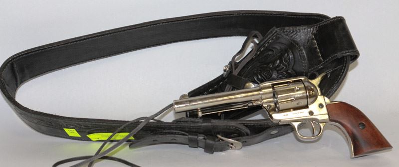 LEATHER GUN BELT WITH 6-SHOOTER REPLICA GUN