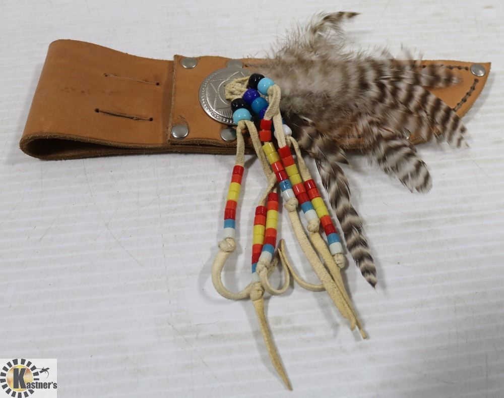 LEATHER KNIFE SHEATH WITH SILVER CONCHO, BEADS &