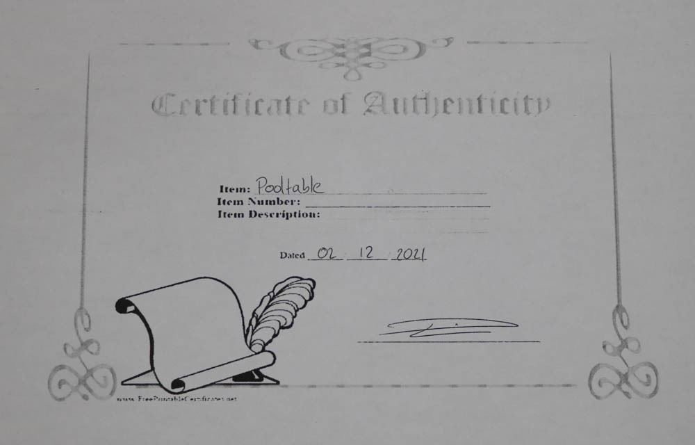 COMES WITH COA - THIS WAS LEONS PERSONAL POOL TABLE JUST REMOVED TO MAKE ROOM TO WORK OUT - GREAT CONVERSATION PEICE - *RESERVED* CALL ON HIGH BID