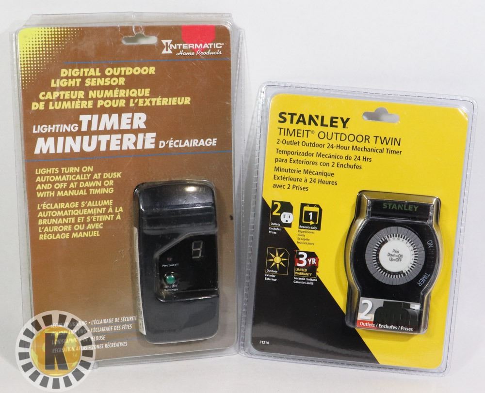 ESTATE. NEW. UNTESTED LIGHTING TIMER- INTEMATIC HOME PRODUCTS; DIGITAL OUTDOOR LIGHT SENSOR STANLEY TIMEIT OUTDOOR TWIN2- OUTLET OUTDOOR 24HOUR MECHANICAL TIMER***ITEM LOCATED IN LETHBRIDGE ALBERTA