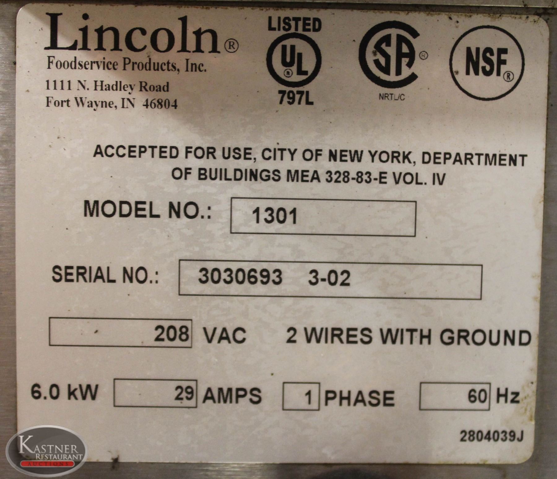 M#: 1301, ELECTRIC SINGLE PHASE, 208V, 30A. W/ SERVICE CORD AND PLUG. *TESTED & WORKING*