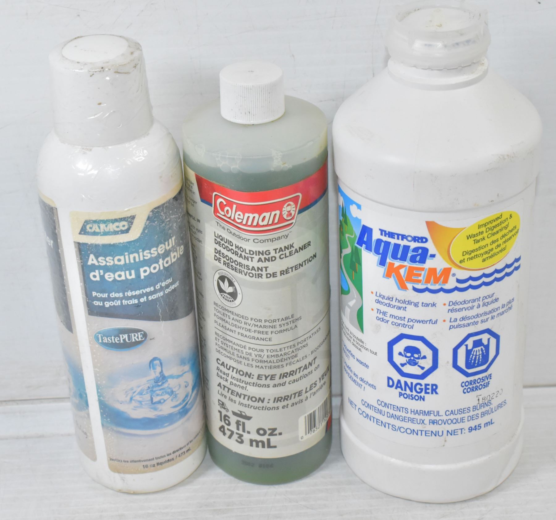 3 BOTTLES COLEMAN 16OZ THETFORD AQUA CHEM 946ML CAMCO 16 OZ DRINKING WATER FRESHENERNEW