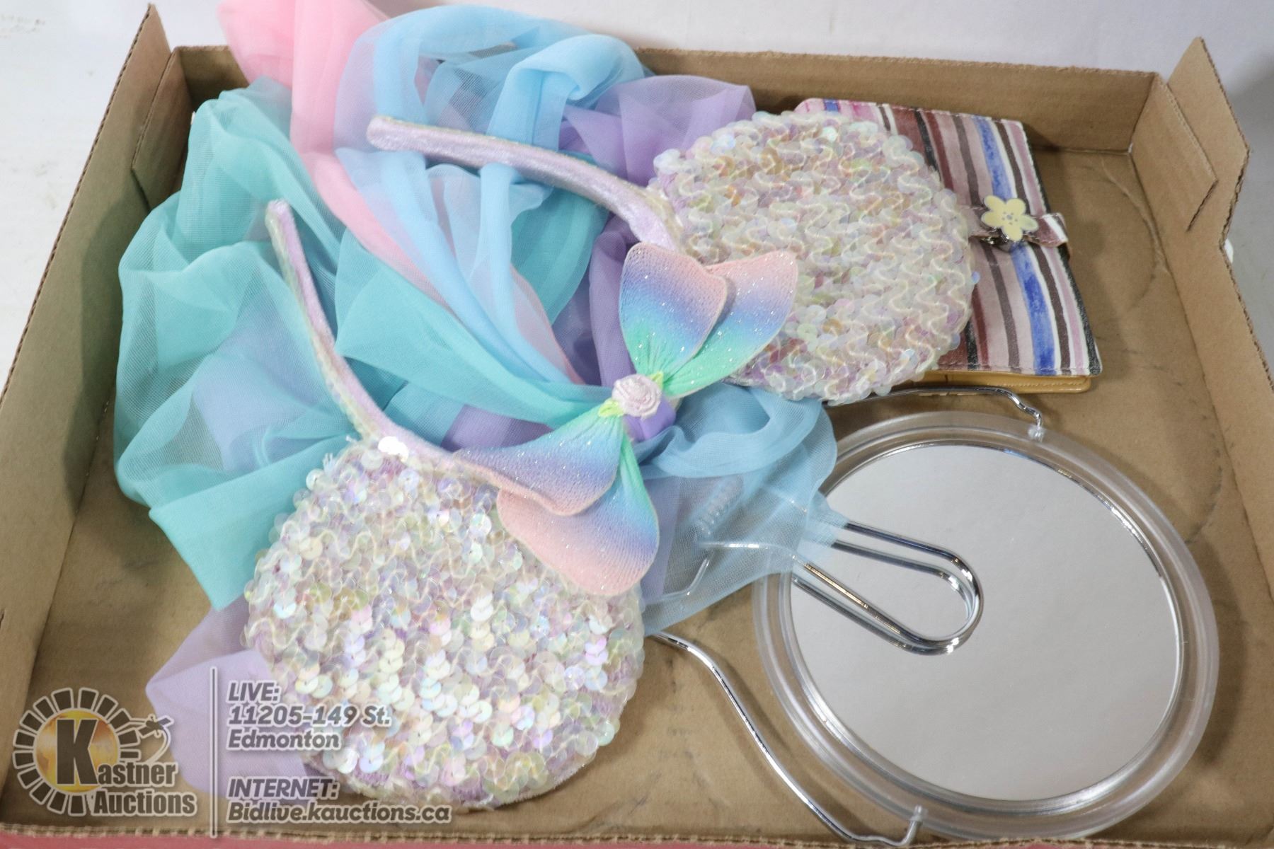 SPARKLE HEADBAND WITH EARS N BOW AND SCARF, STANDING MIRROR AND NEW GIRLS WALLET