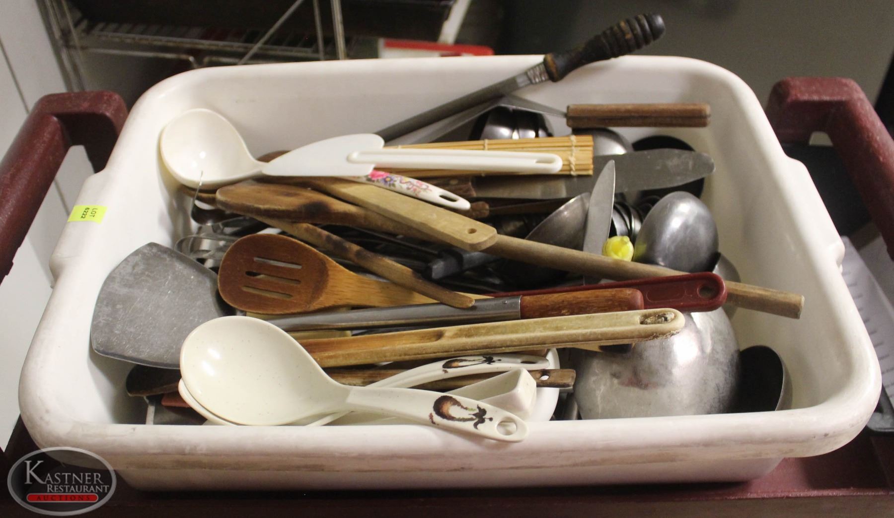 LOCATION #1. BUS BIN OF ASSORTED KITCHEN UTENSILS INCL: TONGS,