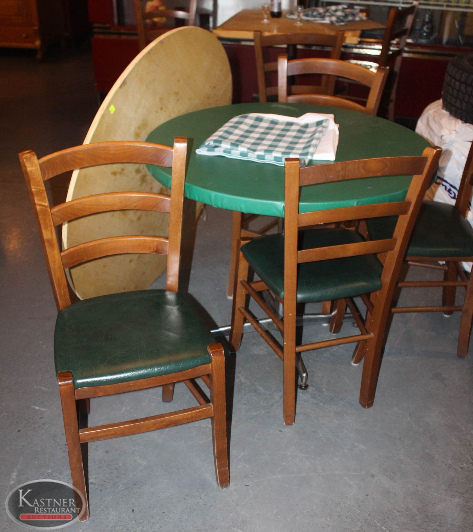 LOCATION #1. ROUND WOODEN DINING TABLE W/ 4 WOOD & LEATHERETTE