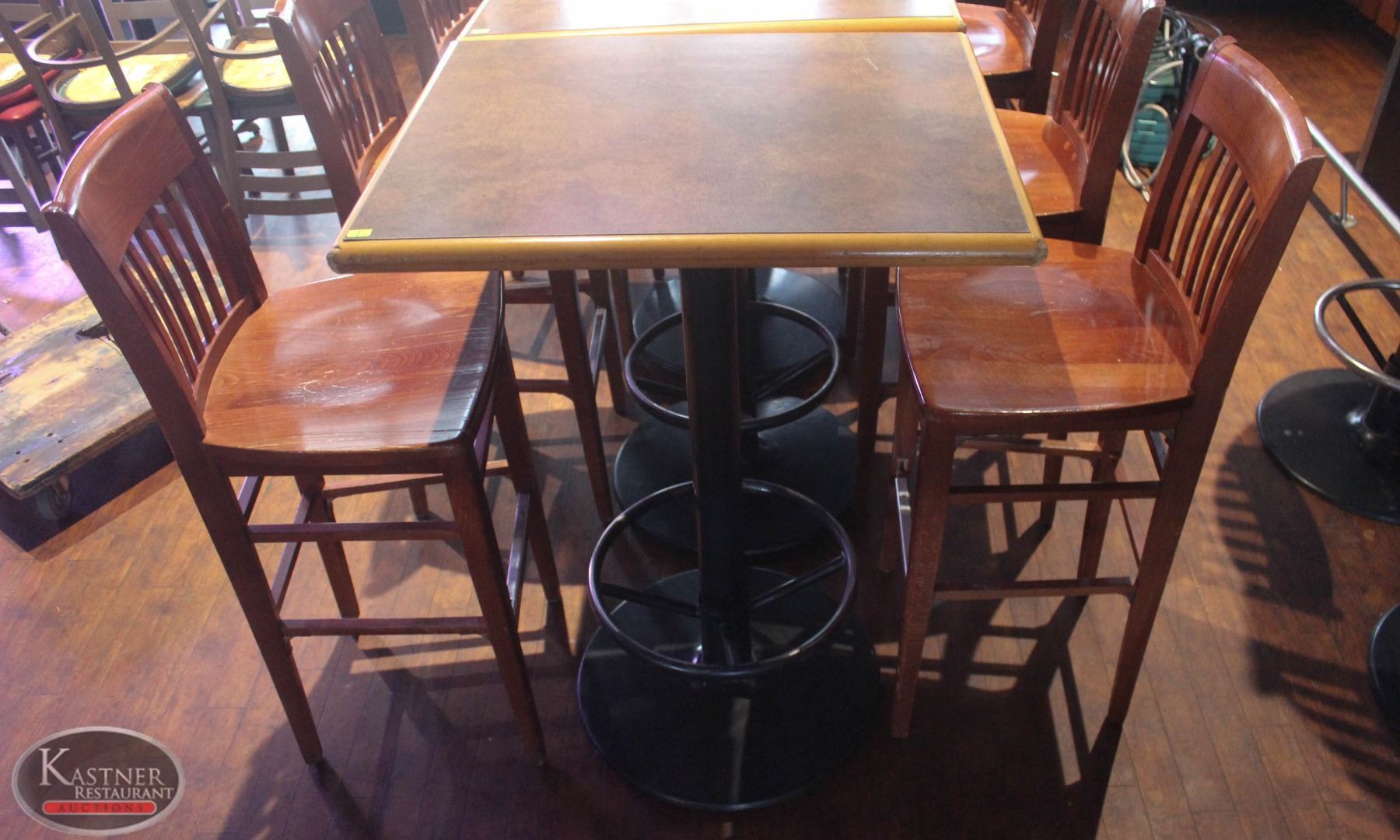 LOCATION #2. RECTANGULAR BAR HEIGHT TABLE W/ 2 WOOD BAR CHAIRS