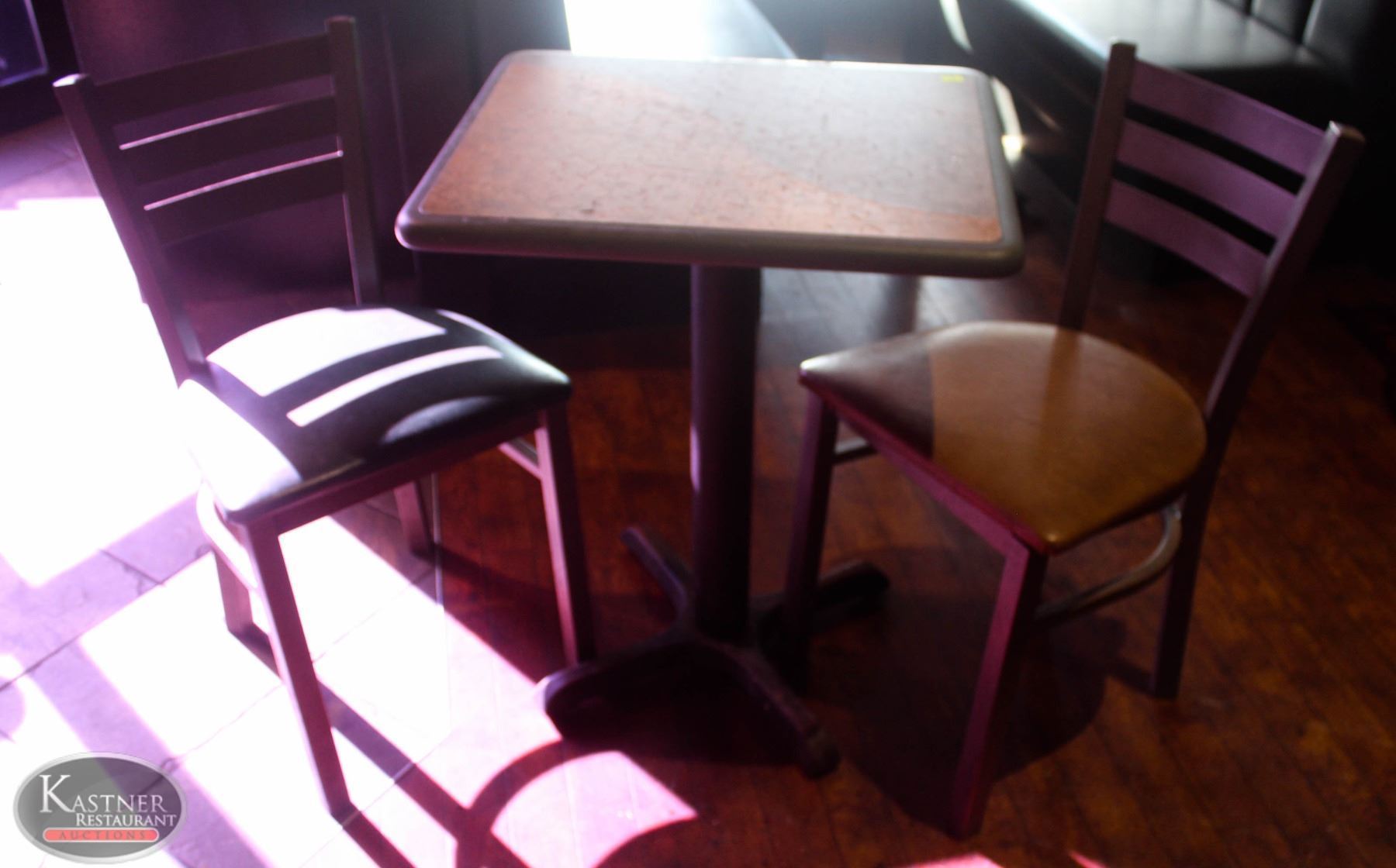 LOCATION #2. RECTANGULAR DINING TABLE W/ 2 PADDED METAL CHAIRS