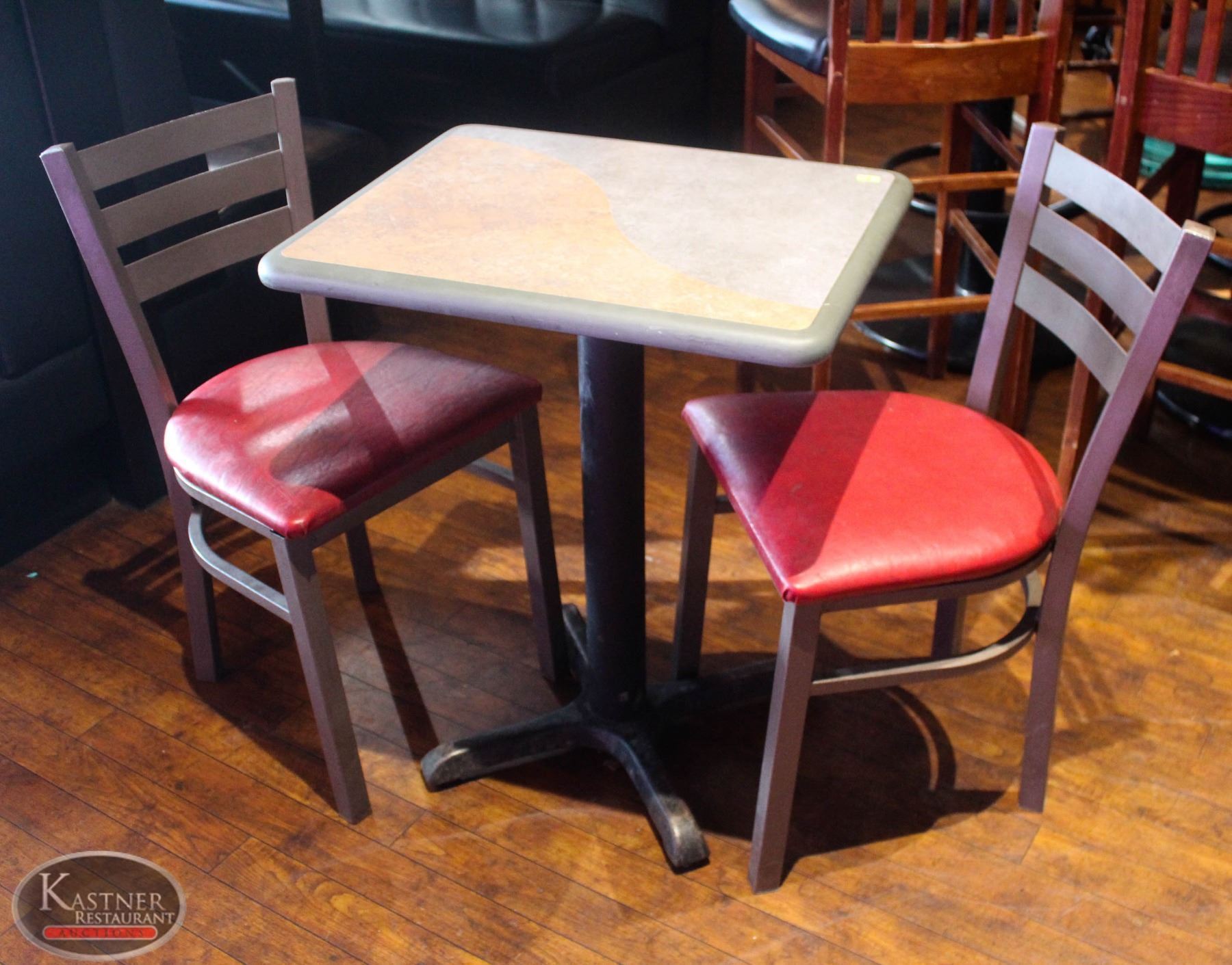 LOCATION #2. RECTANGULAR DINING TABLE W/ 2 PADDED METAL CHAIRS