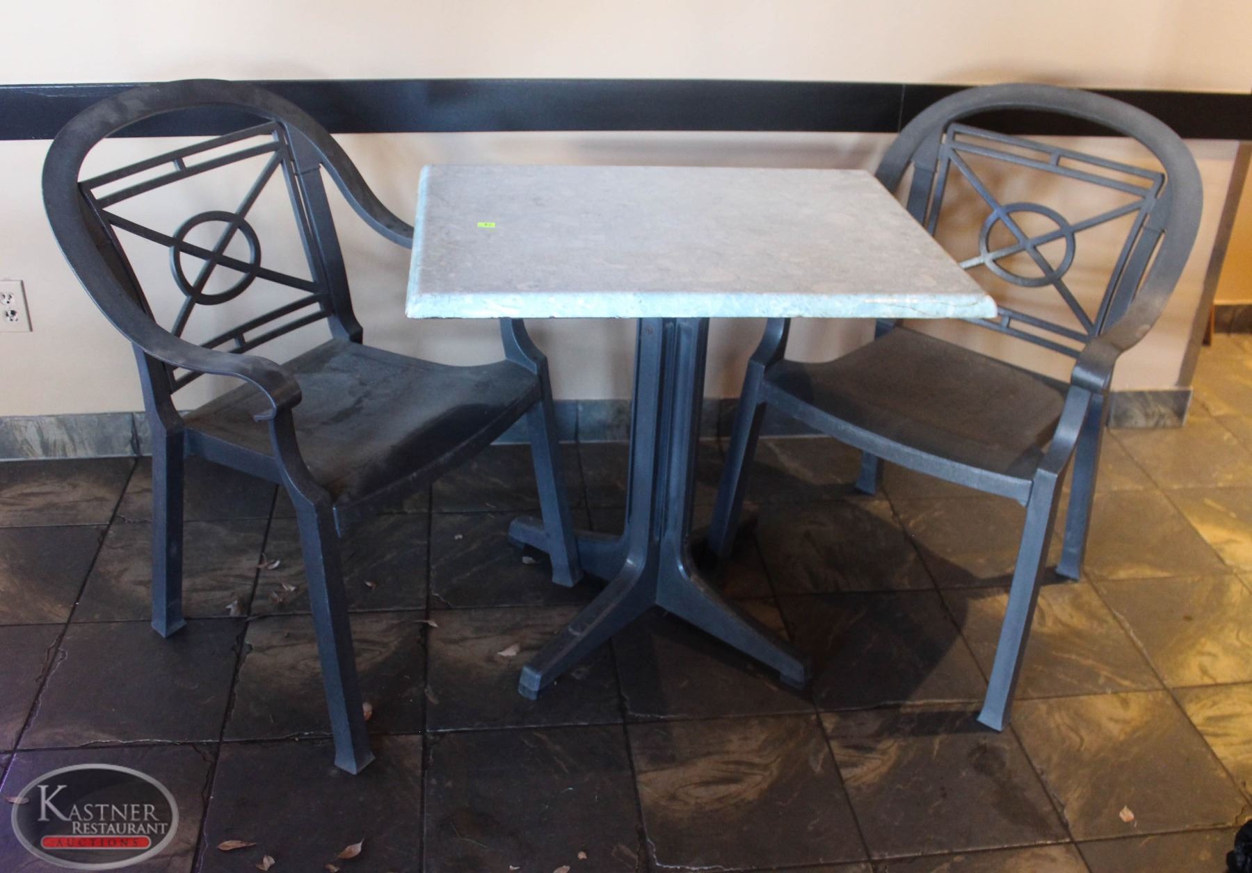 LOCATION #2. RECTANULAR PATIO TABLE W/ 2 PLASTIC PATIO CHAIRS