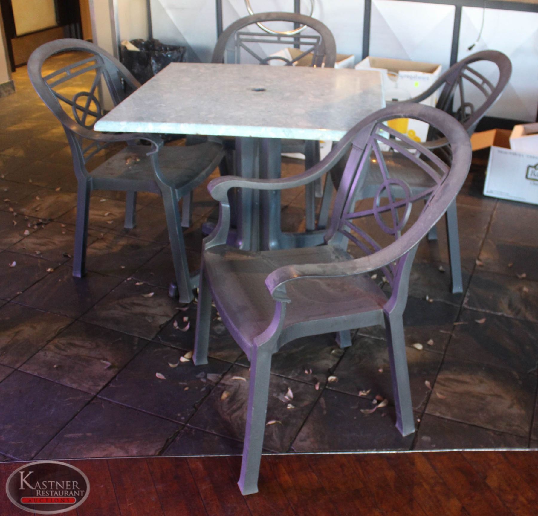 LOCATION #2. SQUARE PATIO TABLE W/ 4 PLASTIC PATIO CHAIRS